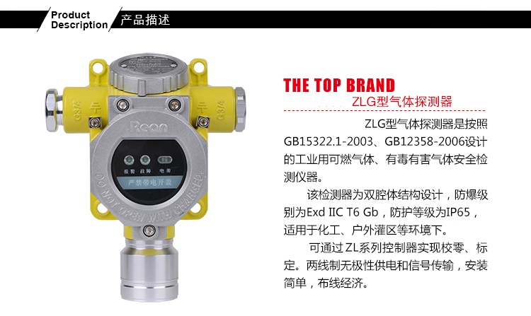 RBT-6000-ZLG型氣體探測(cè)器是 按照GB15322.1-2003、GB12358-2006設(shè)計(jì)的工業(yè)用有毒有害氣體安全檢測(cè)儀器;該探測(cè)器為雙腔體結(jié)構(gòu)設(shè)計(jì),防爆等級(jí)為Exd II CT6 Gb,防護(hù)等級(jí)為IP65,適用于化工、戶(hù)外灌區(qū)等環(huán)境下。RBT-6000-ZLG型氨氣泄漏報(bào)警器可通過(guò)RBK-6000-ZL系列控制器實(shí)現(xiàn)校 零、標(biāo)定;兩線制無(wú)極性供電和信號(hào)傳輸,安裝簡(jiǎn)單,布線經(jīng)濟(jì)。RBT-6000-ZLG/B型氨氣探測(cè)器采用進(jìn)口電化學(xué)傳感器,靈敏度高反應(yīng)速度快,廣泛 應(yīng)用于食品加工、倉(cāng)儲(chǔ)、冷庫(kù)、制冷車(chē)間、冶金、石油、石化、化工、輕工等行業(yè)。