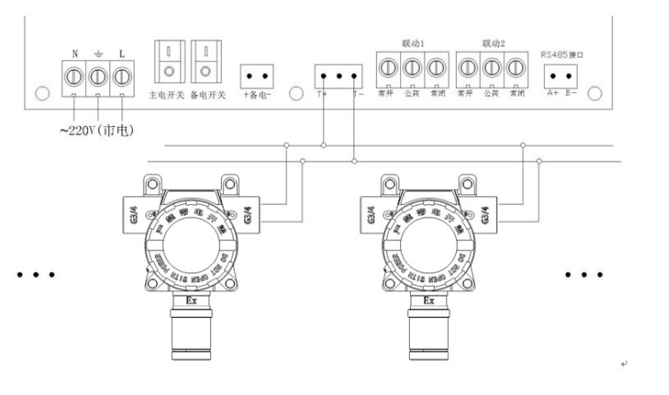 控制器和探測器上有對應(yīng)的接線端口,JB-TB-JX800控制器上有對應(yīng)接線端口T+、T-,探測器對應(yīng)端口是標(biāo)識(shí)“總線”的端子,兩總線安裝,接線不用區(qū)分正負(fù)極?刂破靼惭b在距離地面1.5米便于觀察的高度,壁掛式垂直地面安裝,隨貨帶有安裝支架,可用膨脹螺絲將主機(jī)固定到墻面上;探測器屬于防爆設(shè)備,是安裝在探測現(xiàn)場,用來檢測作業(yè)區(qū)間氫氣濃度,其外殼設(shè)計(jì)帶有4個(gè)膨脹螺絲孔,可以用膨脹螺絲固定到墻壁上,安裝高度選擇距離地面30-60公分的位置。