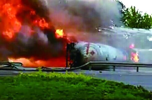 5月23日下午5點(diǎn)多,從老家章丘圣井返回濟(jì)南,剛走出社區(qū),就看到東邊有濃煙冒氣,后來才知道原來是一輛載送22噸的液化氣罐車側(cè)翻了。巨大的撞擊力導(dǎo)致液化氣罐開裂,大量液化氣漏出導(dǎo)致燃起大火。