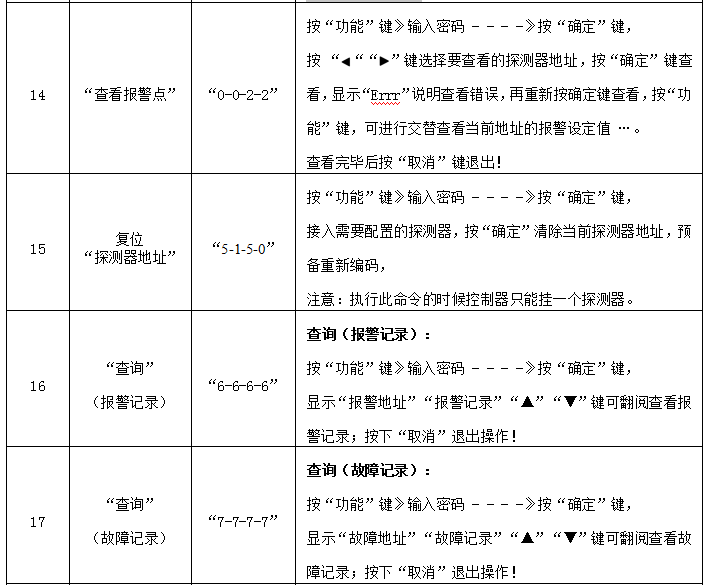 11、“探測器編址”----“7-0-1-5”要求:控制器不能接其他探測器,且主機檢測出探測器離線并發(fā)出故障報警---“7-0-1-5”,按“功能”鍵輸入密碼--->按“確定”鍵,“▲”“▼”調至需要的地址,接入需要配置的探測器,按“確定”顯示good,地址+1,當前探測器編址成功,連續(xù)接入需要配置的探測器,按“確定”顯示good,地址+1,依次編址(顯示ERR,編址失。