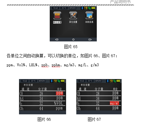 在測(cè)試界面按一下“MENU”鍵進(jìn)入菜單,通過(guò)“《《”和“》》”選擇到第二頁(yè)“單位位置”菜單,按“圈1”鍵計(jì)入設(shè)置界面,各單位之間自由轉(zhuǎn)換,可以切換的單位:ppm、VOL%、LEL%、ppb、pphm、mg/m3、mg/L、g/m3,如下所示: