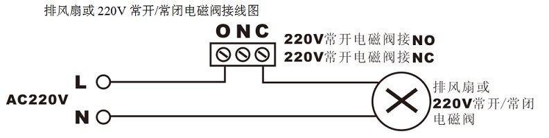 第二、開關(guān)量信號,聯(lián)動的是AC220V的常開/常閉電磁閥或者排風(fēng)扇,此時需要內(nèi)部單獨取電構(gòu)成電流回路。一般一套系統(tǒng)里面會有2組開關(guān)量聯(lián)動輸出,一組是用來聯(lián)動電磁閥,一組是用來聯(lián)動排風(fēng)扇,主要針對設(shè)有2級報警輸出的天然氣報警器。一級報警說明天然氣有微量泄漏,此時無需切斷燃氣管道,只需要將室內(nèi)少量天然氣通過排風(fēng)扇排放到室外,降低室內(nèi)天然氣濃度既可,因此啟動排風(fēng)扇。二級報警說明天然氣泄漏量已經(jīng)超過其爆炸下限的50%,危險性加大,此時需要斷氣防止天然氣繼續(xù)泄漏,因此啟動電磁閥。具體連接接線圖示如下: