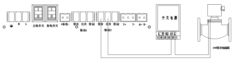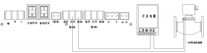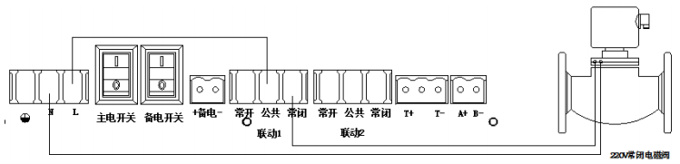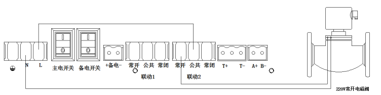◆ 若電壓為 AC220V 功率小于 1000W 的常閉電磁閥,接線位置不是在“聯(lián)動(dòng) 2”,而是在“聯(lián)動(dòng) 1”的“常閉”和“公共”接線圖示如下: