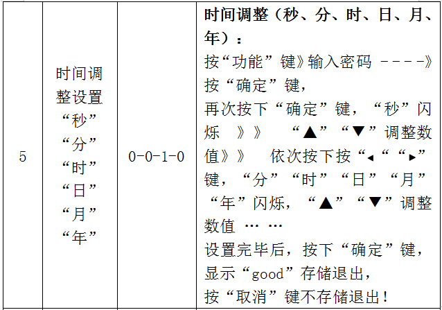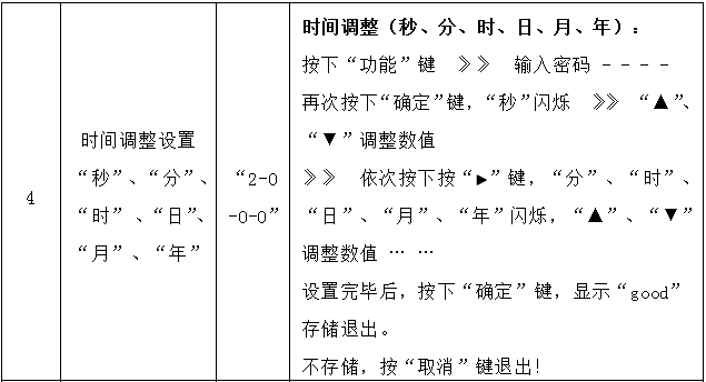 時(shí)間調(diào)整設(shè)置“秒”“分”“時(shí)”“日”“月”“年”,按“功能”鍵,輸入密碼0-0-1-0,按“確定”鍵,再次按下“確定”鍵,“秒”閃爍“▲”“▼”調(diào)整數(shù)值, 依次按下按“左向鍵““右向鍵”,“分”“時(shí)”“日”“月”“年”閃爍,“▲”“▼”調(diào)整數(shù)值 … …,設(shè)置完畢后,按下“確定”鍵,顯示“good”存儲(chǔ)退出, 按“取消”鍵不存儲(chǔ)退出!