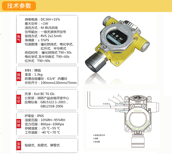 該產(chǎn)品是嚴(yán)格按照國(guó)家GB15322.1-2003、GB12358-2006設(shè)計(jì)的工業(yè)用可燃?xì)怏w、有毒有害氣體安全檢測(cè)儀器。該設(shè)備為雙腔體結(jié)構(gòu)設(shè)計(jì),防爆級(jí)別為ExdIIC T6 Gb,防護(hù)等級(jí)為IP65,適用于化工,戶外罐區(qū)等環(huán)境。該設(shè)備可和RBK系列的氣體報(bào)警控制器配套使用,實(shí)現(xiàn)遠(yuǎn)程監(jiān)控、調(diào)零、物聯(lián)網(wǎng)通訊等操作。構(gòu)成的系統(tǒng)屬于兩線制布線機(jī)構(gòu),不用區(qū)分正負(fù)極,節(jié)省線材和人工,安裝簡(jiǎn)單便捷!